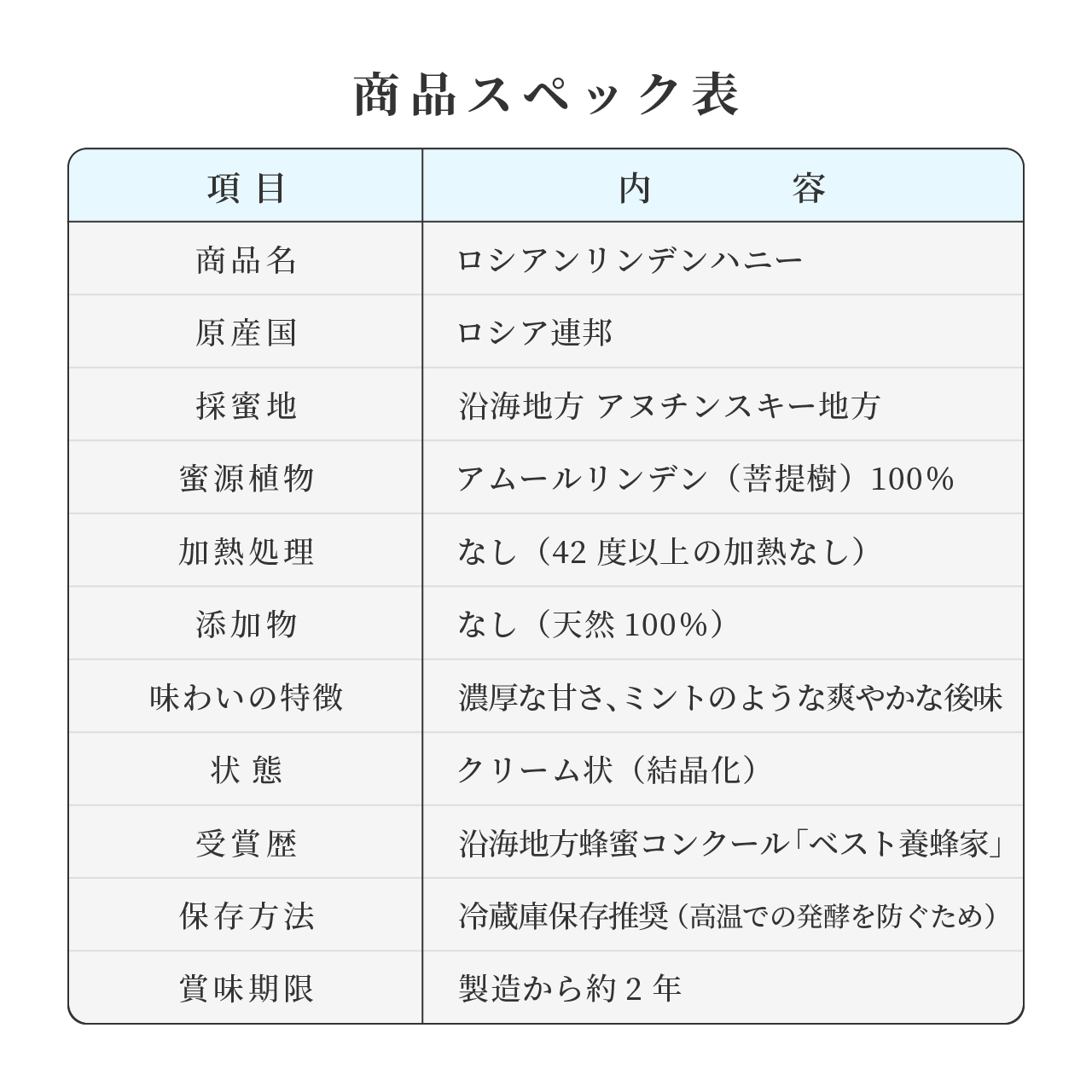 アムール川流域にしかない「アムールリンデン」と呼ばれるロシア固有の菩提樹の花から採取されたこの蜂蜜は香りが高く、濃厚な自然な甘さとミントのような爽やかな後味が魅力です。
